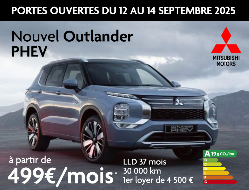 Offres réservées aux particuliers, valables pour toute commande d’un MITSUBISHI OUTLANDER PHEV neuf entre le 01/07/2025 et le 30/09/2025, dans la limite des stocks disponibles et non cumulables avec d’autres offres en cours, chez tous les distributeurs participants (voir conditions de l’offre en concession).